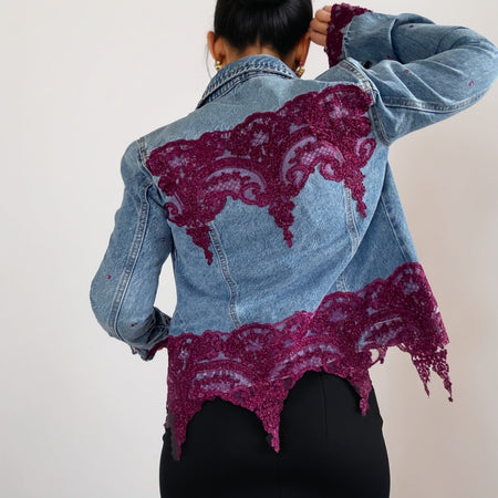 Sold Out Magenta Foil & Lace Hand-Embellished Jean Jacket | Unique | Size : XS | Missey & Daff now $130.00 $325.00 60% off