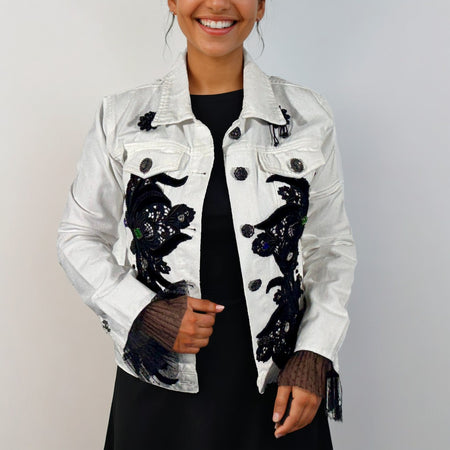 Handmade White Denim Jacket – Embellished with Black Floral Appliqué & Beads | Unique | Missey & Daff